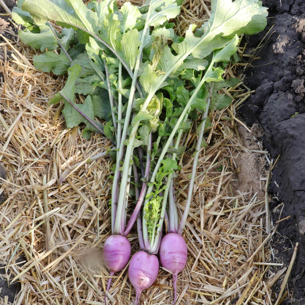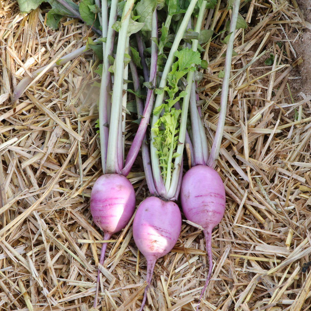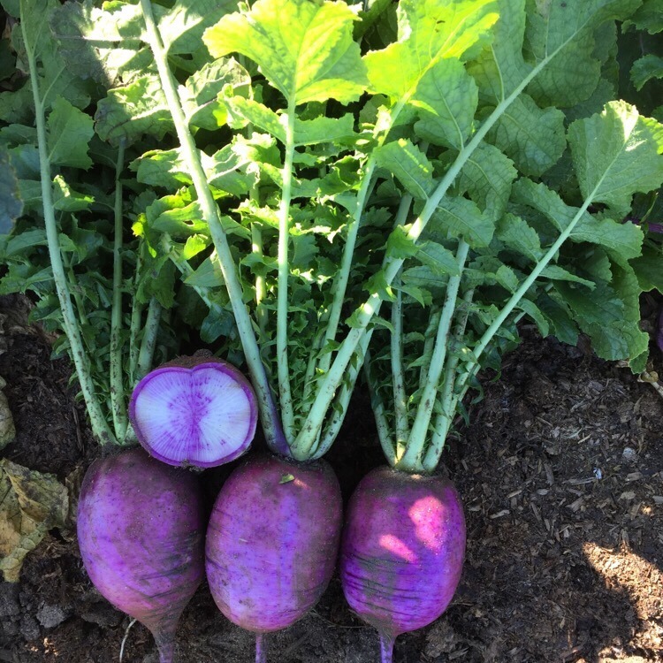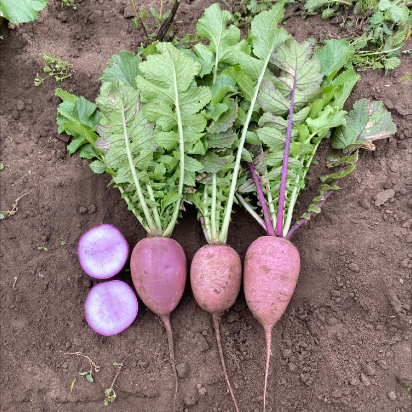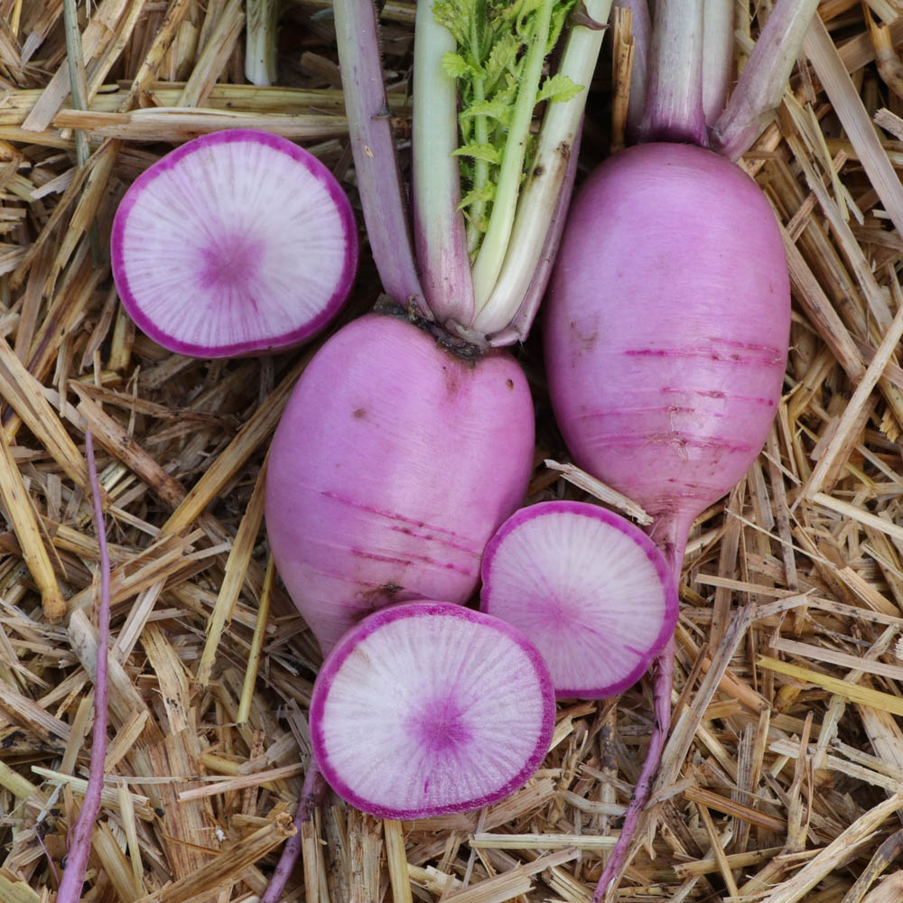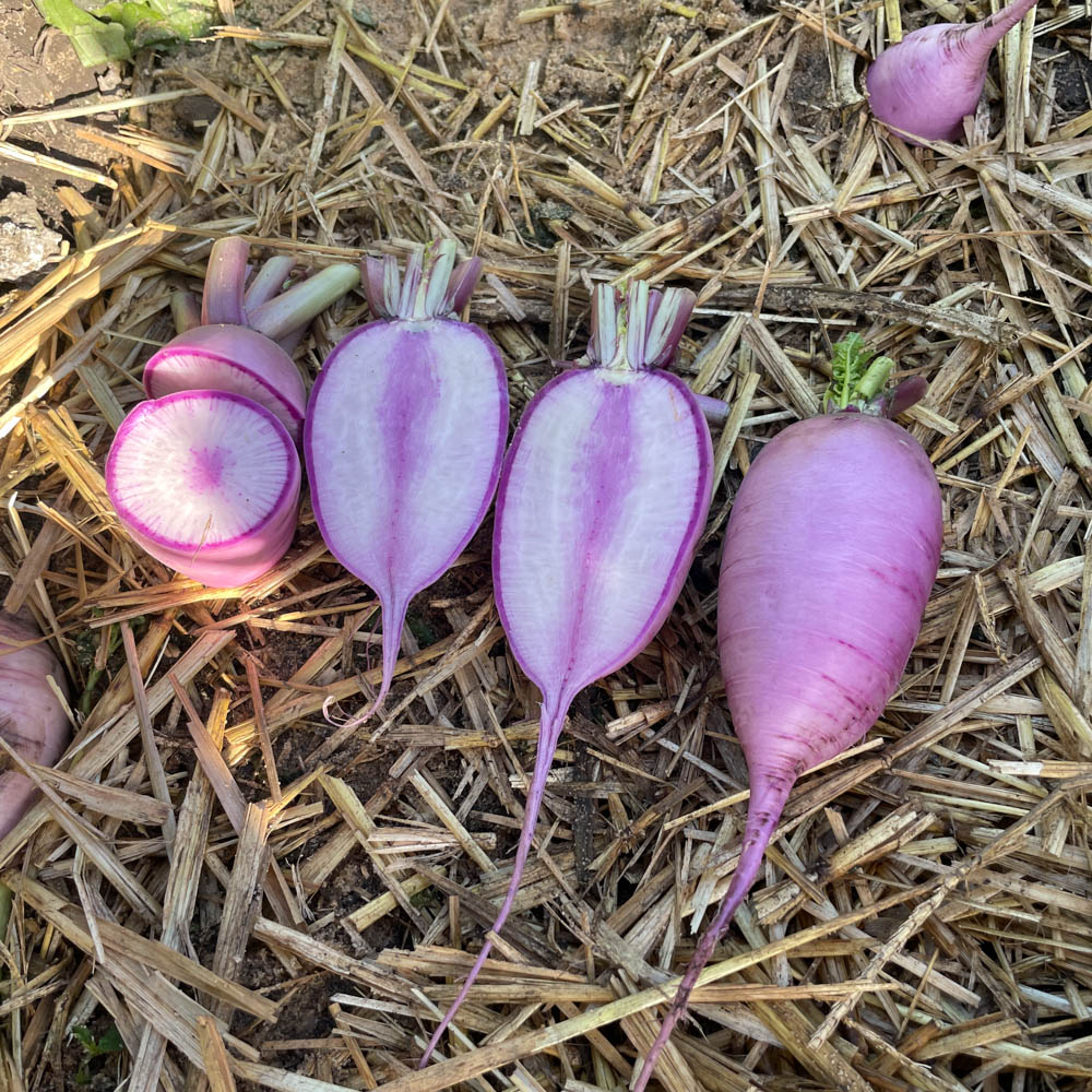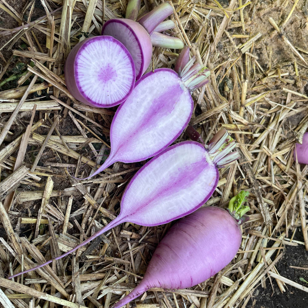 - Specialty daikon radish, with light purple to pink colour skin and purple and green stems